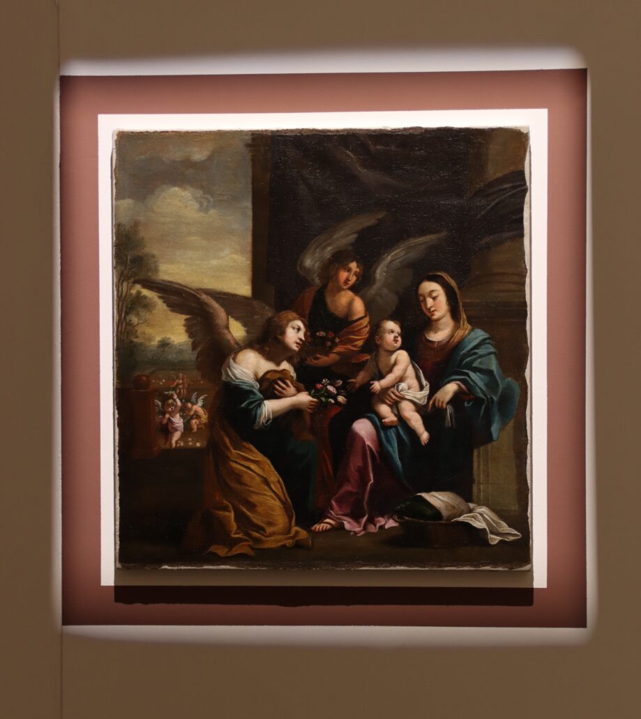 Adoracja Dzieciątka przez anioły. Przypisywany nieokreślonemu warsztatowi północnowłoskiemu. Być może druga połowa XVII w. Obraz był poddawany renowacji w XVIII w. W trakcie obecnych prac konserwatorskich odsłonięto jego pierwotną, pogodną kolorystykę. W zbiorach klasztoru Wizytek w Warszawie. Fot. Jerzy S. Majewski