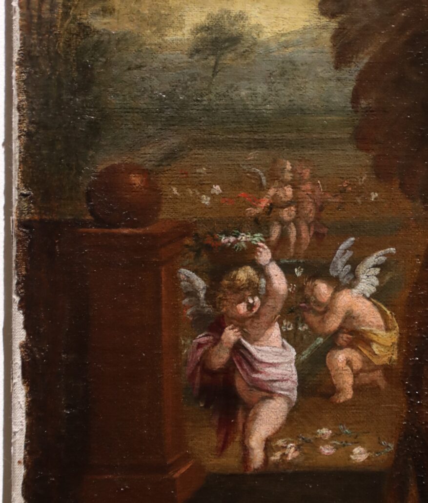 Adoracja Dzieciątka przez anioły. Widoczny w tle pejzaż z aniołkami baraszkującymi w ogrodzie. W zbiorach klasztoru Wizytek w Warszawie. Fot. Jerzy S. Majewski