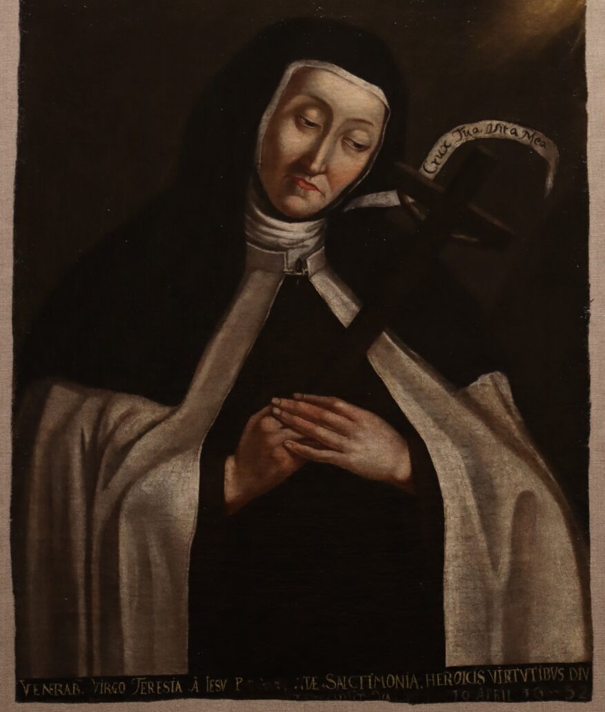 Portret matki Teresy od Jezusa Marchockiej. Przypuszczalnie polski warsztat cechowy czynny w Warszawie. Obraz ten stał się wzorcem dla wielu innych wyobrażeń przeoryszy karmelitanek, obrazów i grafik. Był on z biegiem czasu naprawiany i przemalowywany. W trakcie prac restauracyjnych nie przywrócono pierwotnych rozmiarów. Jak czytamy w broszurze do wystawy „Thesaurus”, „zachowując widoczną dla odbiorcy, neutralną w formie bordiurę, pozostawiono widoczne zmiany, jakim podlegał, taktując je jako integralną z wizerunkiem historię obiektu”. W zbiorach klasztoru Wizytek w Warszawie. Fot. Jerzy S. Majewski