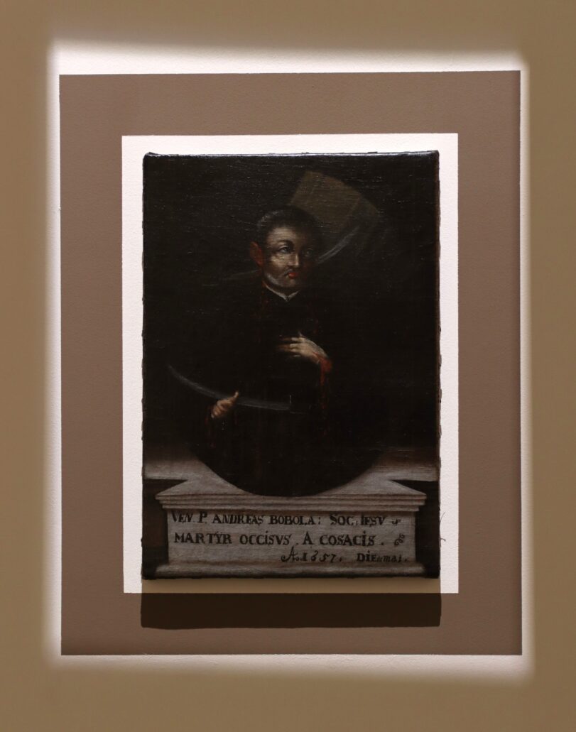Św. Andrzej Bobola. Nieznany warsztat cechowy polski. Być może pierwsza dekada XVIII w. Jak czytamy w broszurze do wystawy „Thesaurus”, obraz ten był w posiadaniu rodziny świętego. Do klasztoru wizytek został przeniesiony jako wiano Ludwiki Heleny Zborowskiej, późniejszej przełożonej i być może prawnuczki siostry Andrzeja Boboli. W początku XVIII po odnalezieniu szczątków jezuity i ekshumacji jego ciała zaczął się jego kult. Odżył on w niepodległej Polsce, kiedy to w 1938 r. szczątki świętego zostały uroczyście przewiezione do Warszawy i złożone w kaplicy kompleksu jezuickiego Bobolanum przy ul. Rakowieckiej. W zbiorach klasztoru Wizytek w Warszawie. Fot. Jerzy S. Majewski